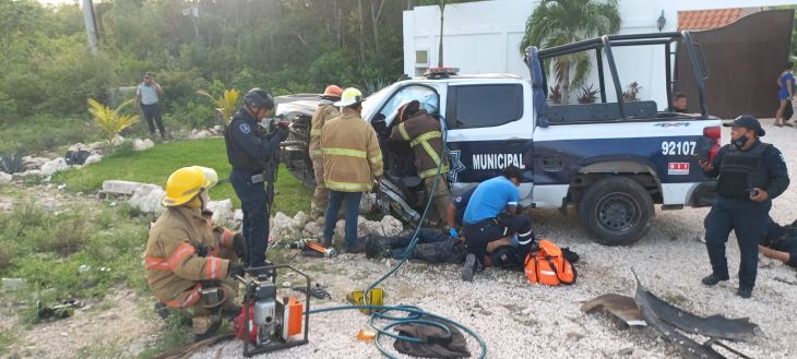 Un choque frontal sobre la carretera federal Tulum-Felipe Carrillo Puerto entre un vehículo Honda modelo Civic y una patrulla del Policía Municipal de Tulum dejó como saldo un policía muerto, cuatro oficiales más lesionados y los cuatro pasajeros del carro compacto también heridos.