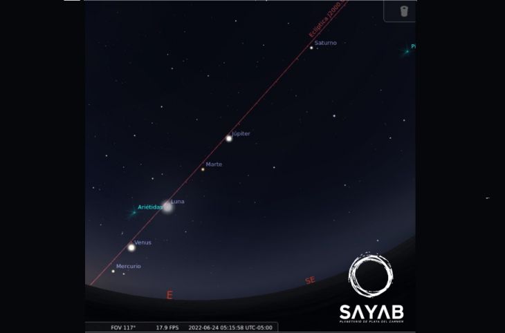 “Este desfile planetario lo podrás ver en dirección este, desde aproximadamente una hora antes de la salida del Sol y hasta que el brillo del mismo opaque a los planetas. Si lo contemplas entre el 22 y 27 de junio también verás a la Luna moviéndose día a día entre los planetas a medida que avanza hacia su fase nueva”, indica Sayab.
