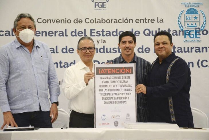 Óscar Montes de Oca Rosales, titular de la Fiscalía General del Estado (FGE) de Quintana Roo, firmó un convenio de colaboración con José Julio Villarreal Zapata, presidente de la Cámara Nacional de la Industria de Restaurantes y Alimentos Condimentados (Canirac) de Cancún, en el que -entre otros puntos- los propietarios de los establecimientos afiliados a la cámara otorgarán las facilidades necesarias para que personal acreditado y autorizado de la FGE pueda ingresar a realizar las revisiones pertinentes con la finalidad de atender o inhibir alguna actividad ilícita relacionada con el narcomenudeo o algún otro delito.