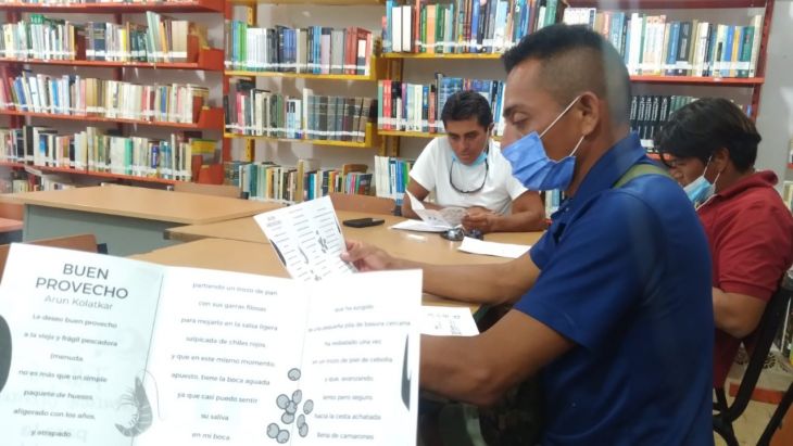 Las primeras sesiones de esta actividad en la biblioteca se realizaron en colaboración con Mar Sustentable, quienes extendieron una invitación a los pescadores que participaron en la elaboración de su investigación. Para invitar a plasmar por escrito sus experiencias, se compartieron con ellos lecturas inspiradas en la pesca, como la Oda a un gran atún en el mercado, de Pablo Neruda, El pez, de Elizabeth Bishop y un poema de Arun Kolatkar, un escritor de la India.