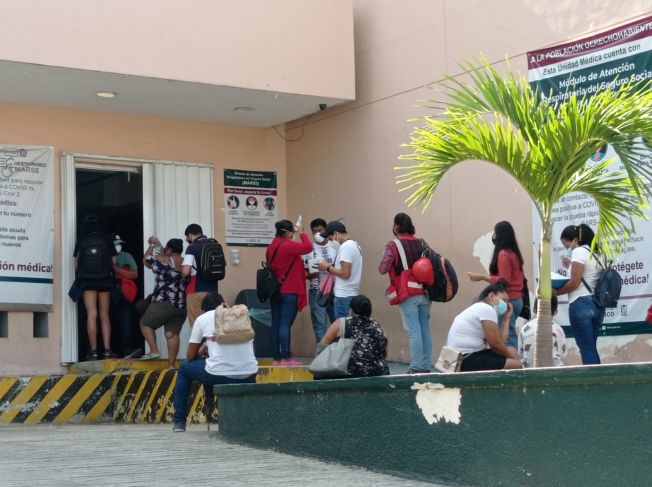 La mañana de este lunes una larga fila de personas se encontraba en la clínica del IMSS del centro de Playa del Carmen para tramitar su incapacidad debido a que habían resultado positivos al virus. Otros más solicitaban les hicieran la prueba porque sentían síntomas.