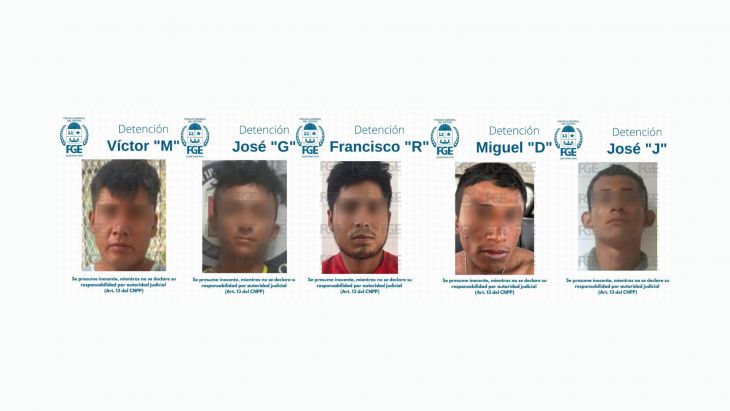Agentes de la Policía de Investigación lograron la detención de José J., José G., Miguel D., Francisco R. y Víctor M. por su probable participación en el delito de homicidio en agravio de dos víctimas del sexo masculino, cuyos cuerpos sin vida fueron localizados en el fraccionamiento Paseos Kusamil del municipio de Benito Juárez.