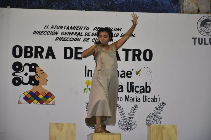 La artista Christi Uicab presentó su obra de teatro In k’aabae’ María Uicab (Me llamo María Uicab) en el escenario cultural del parque Museo Maya de Tulum, con el objetivo de que la historia de los mayas se impregne y concientice a las nuevas generaciones.