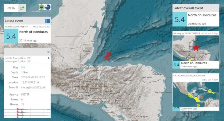 La Coordinación de Protección Civil (Copeco) de Honduras informó en sus redes sociales de un sismo de magnitud 5.9, con profundidad de un kilómetros, al noroeste de Utila, en el sistema de fallas del Cisne, “interacción de placas de Norteamérica-Caribe. Se reporta de todo el país. Favor reportar daños al 911”.