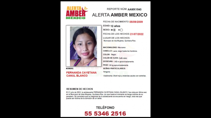 Fue el pasado 21 de julio cuando la menor Fernanda Cayetana Canul Blanco, de 12 años de edad, desapareció en la zona continental de Isla Mujeres y hasta ahora no hay pistas sobre su paradero. Su madre denunció que sufrió un intento de privación de la libertad.