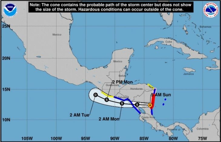 El pronóstico es que Julia tras atravesar Nicaragua y salir al océano Pacífico ya como tormenta tropical afecte las costas de El Salvador y Guatemala, donde continuará degradándose. Se prevé que la tarde del lunes sea una depresión tropical.