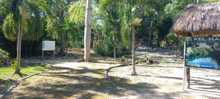 La zona arqueológica de Xel Há (nombre maya que significa “entrada de agua”) se ubica a 16 kilómetros de la cabecera municipal de Tulum y no es administrada ni se encuentra dentro de los terrenos de Grupo Xcaret, aunque está prácticamente frente a ellos.
