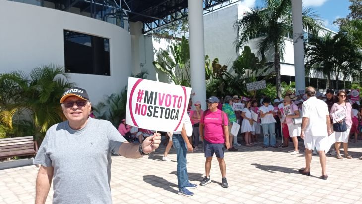 "Yo defiendo al INE, mi voto no se toca" fue la frase que corearon decenas de personas que se concentraron en la explanada del nuevo palacio municipal de Solidaridad este domingo como parte de la manifestación nacional en favor del Instituto Nacional Electoral (INE).