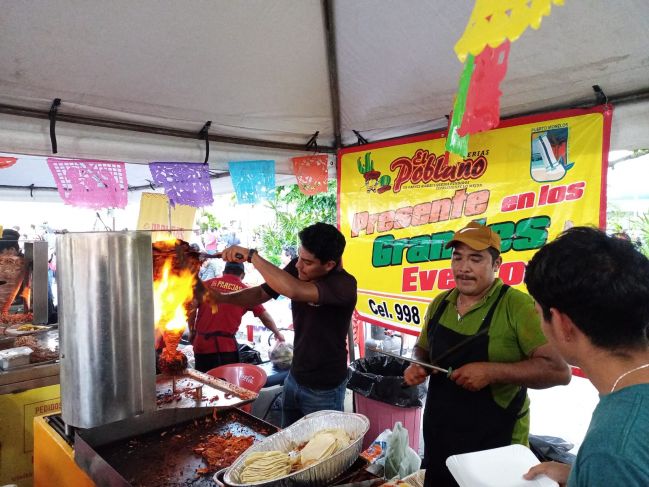 Fue a partir de las 17 horas que una veintena de restaurantes de la ciudad se instaló en la explanada municipal en puestos en los que podían encontrarse trompos de pastor, carne asada, guisados, carnitas, pescados y mariscos, entre otros.