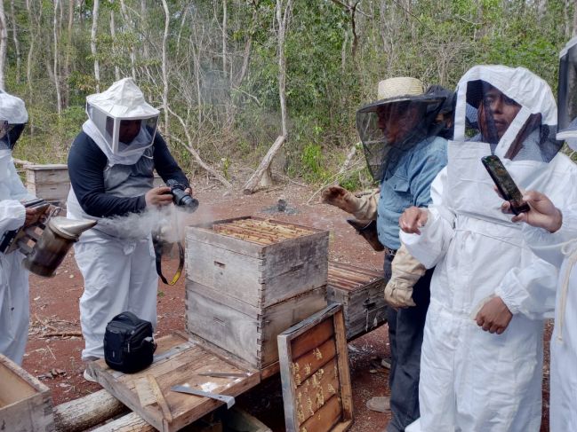 "Nosotros estamos trabajando dos formas, con jobones (un tronco hueco en el que las abejas construyen su colmena) y con cajas tecnificadas, estamos conservando lo que es más de nuestra cultura; es más difícil la extracción de la miel, es más difícil la revisión, pero es la forma tradicional que nosotros queremos enseñarle a los niños, porque ya pocos están trabajando lo que son las meliponas por lo mismo, porque no son muy productivas, pero sí la miel de mejor calidad que hay", indicó Miguel Puc Pat, apicultor de la comunidad de X-Cabil.