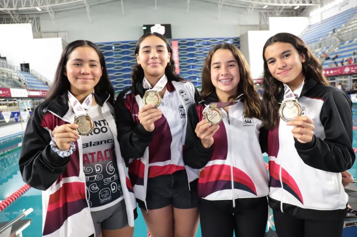 Finalmente, la última medalla de bronce en esta disciplina para Quintana Roo fue por conducto del conjunto de Carlota Martínez, Valentina Ramos, Viviana Duarte y Blanca Patricia Vázquez en los 4x100 metros de la categoría 13-14 años.