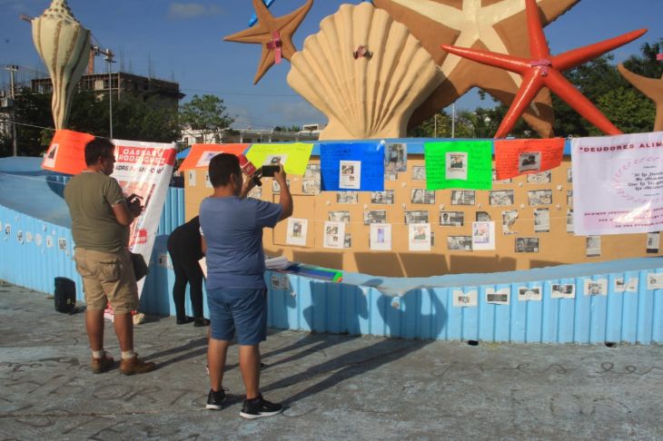 Durante la tarde de este domingo 18 de junio, un grupo de mujeres colocó mantas y carteles con los nombres de por lo menos 30 padres deudores de alimentación en el monumento del Ceviche, en el centro de Cancún.