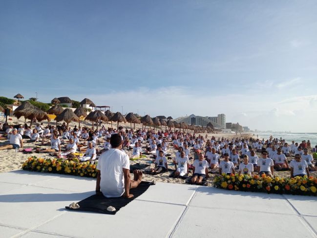 Con motivo del Día Internacional del Yoga, que se celebró el pasado 21 de junio, la mañana de este sábado alrededor de 400 cancunenses disfrutaron de una clase de esta técnica milenaria a cargo del maestro especializado traído directamente de la India, Dr. Ramesh Kumar Singh Yadav, en playa Delfines.