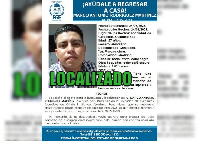 Pero la mañana de este domingo la misma dependencia publicó en redes sociales que desactivaba la ficha de búsqueda de Marco Antonio Rodríguez Martínez, ya que “fue localizado. Agradecemos su colaboración”.
