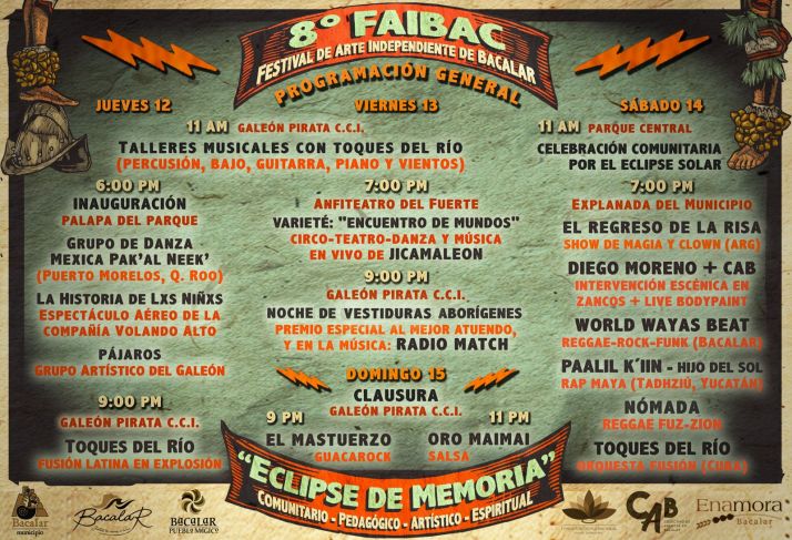 Desde este jueves 12 y hasta el domingo 15 de octubre se llevará a cabo la octava edición del Festival de Arte Independiente de Bacalar (FAIBAC), que además tendrá una celebración comunitaria muy especial el día sábado con el eclipse anular de sol, informó Adrián Arturo Herrera, el capitán del barco Galeón Pirata.
