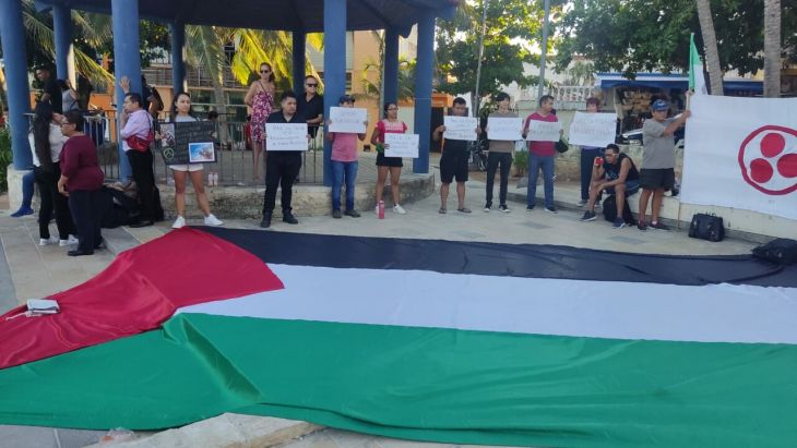 La segunda convocatoria fue para asistir al parque Fundadores de Playa del Carmen este domingo a las 17 horas y hacer una movilización similar. Allí los activistas, partidarios de la paz, desplegaron una serie de pancartas alrededor de una gran bandera palestina.