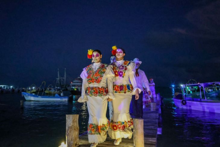 Entre las olas del Mar Caribe desembarcaron catrinas y catrines en el muelle de Puerto Juárez para dar inicio al Janal Pixan 2023 y así comenzar con los festejos de esta importante y colorida tradición para honrar a los fieles difuntos, que se realiza por tercera ocasión en Cancún, el principal destino turístico de México y América Latina. El festival continuará este 1 y 2 de noviembre.