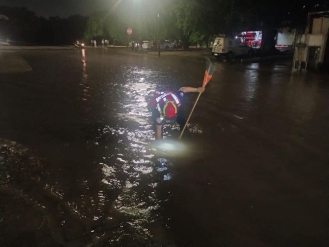 Elementos de las direcciones de Servicios Públicos, Seguridad Pública, Protección Civil y Bomberos atienden esta noche de martes las zonas afectadas por fuertes lluvias en el municipio de Solidaridad.