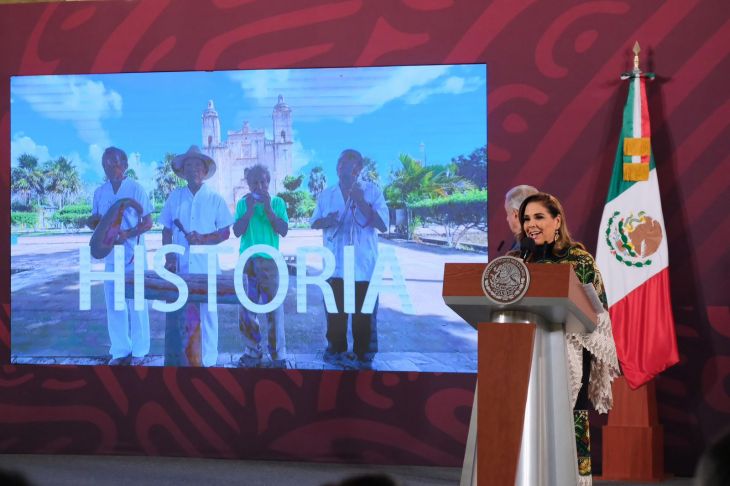 “Estamos a muy pocos días de hacer real el momento que millones de mexicanos esperamos: la inauguración del Tren Maya, el tren de la justicia social y la prosperidad compartida. Este gran proyecto legado suyo, señor presidente, para la historia de México que es mucho más que rieles y vagones. Es la fusión de la modernidad con la reivindicación de la cultura milenaria maya, que es orgullo de nuestra identidad y que debe ser mostrada al mundo”, dijo la mandataria.