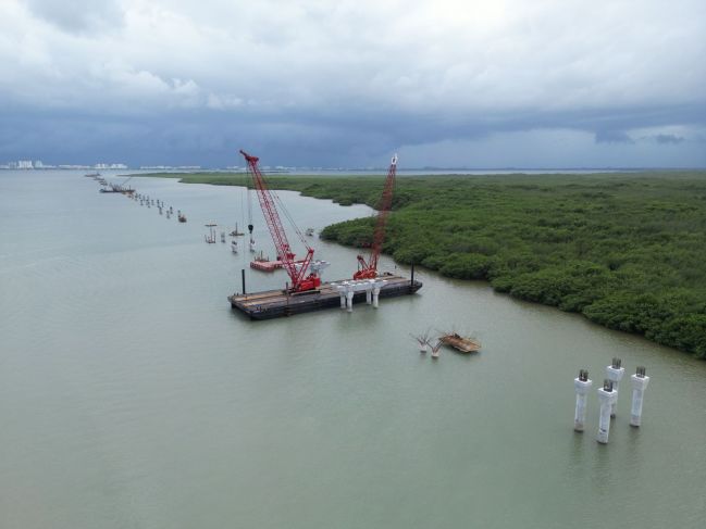 Aproximadamente a mitad del puente vehicular habrá un canal de navegación de 15 metros por donde podrán pasar las embarcaciones: “será una joroba que no dará problemas a quienes circulen sobre el puente Nichupté”. Avanzan también las labores de mitigación, como la reforestación de manglar y un programa piloto de pasto marino; también monitorean a los cocodrilos y otra fauna de la zona, así como analizando la calidad del agua.