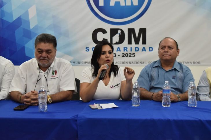 Mayuli Martínez ofreció una conferencia de prensa, en la que estuvo acompañada de los dirigentes estatales del PAN, PRI y PRD, Germán González, Pedro Flota y Leobardo Rojas, respectivamente, así como de candidatos a diputados federales.