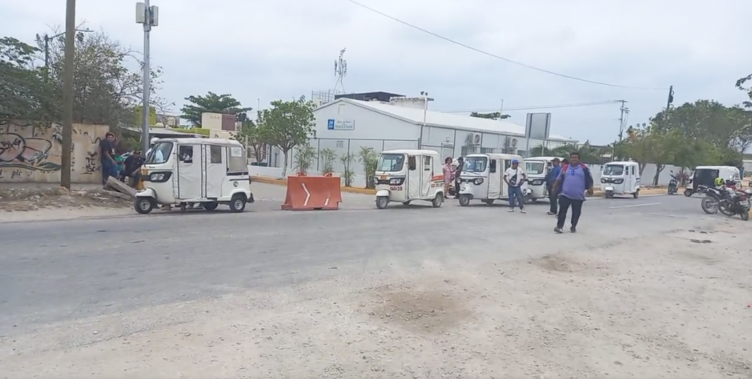 Choferes de mototaxis bloquearon la carretera que comunica a Playa del Carmen con Valladolid, Yucatán, en protesta por la reciente muerte de uno de sus compañeros a manos de un volquetero que trabaja en la obra del Tren Maya.