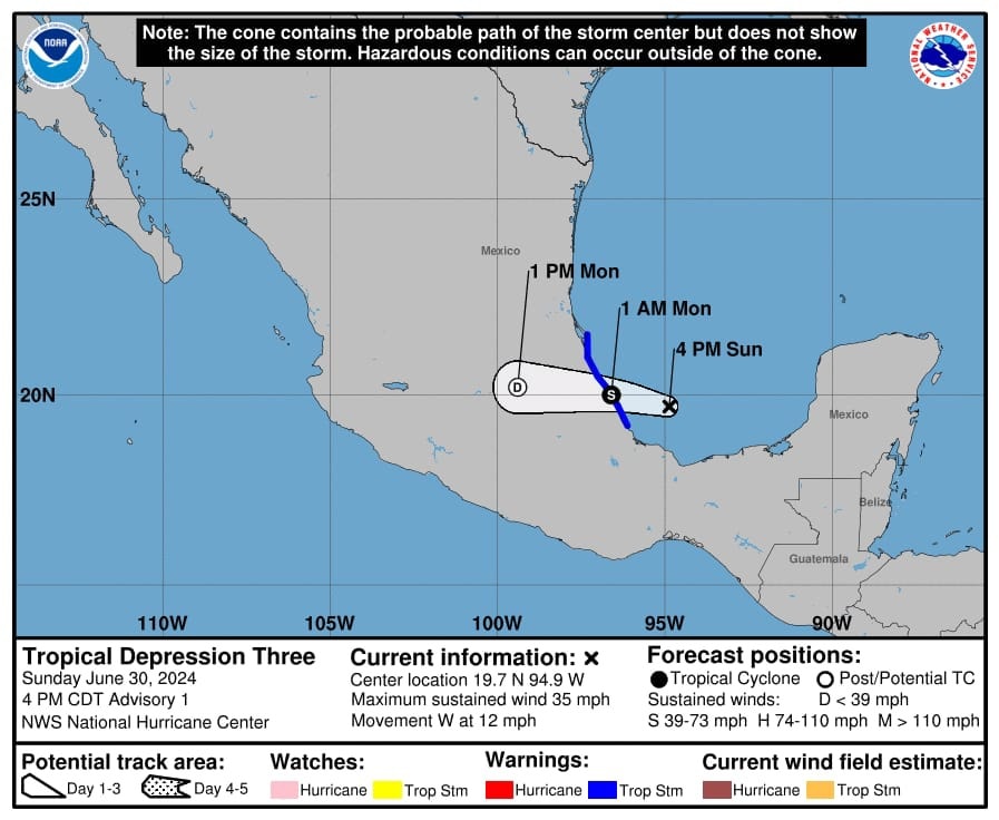 Este domingo se ha formado la depresión tropical 3 en el Golfo de México. Su centro se localiza a 135 kilómetros al noreste de Alvarado, Veracruz, y a 300 kilómetros al este-sureste de Tuxpan, Veracruz. Su amplia circulación ocasiona lluvias fuertes a puntuales muy fuertes en las próximas horas en la península de Yucatán, advirtió la Comisión Nacional del Agua (Conagua).