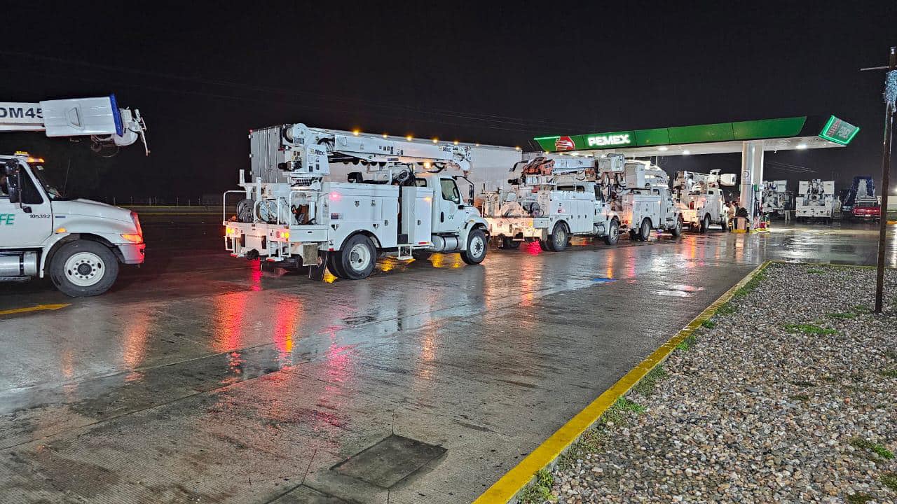 Para la atención de la contingencia, la CFE ha dispuesto en la zona a 2 mil 209 trabajadores electricistas, 360 grúas, 572 vehículos, 68 plantas de emergencia, seis vehículos todo terreno, 27 equipos de comunicación móvil y cinco helicópteros, ubicados en puntos estratégicos.