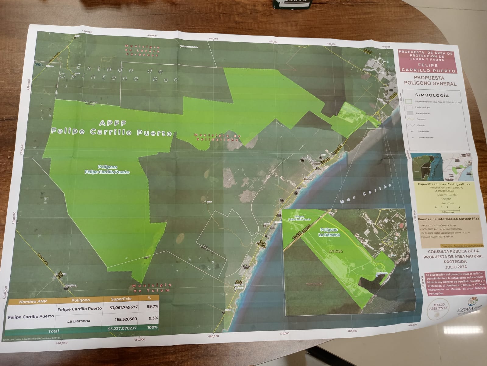 Este proyecto, publicado en el Diario Oficial de la Federación este jueves 18 de julio, fue realizado por la Secretaría de Medio Ambiente y Recursos Naturales (Semarnat) por conducto de la Comisión Nacional de Áreas Naturales Protegidas (Conanp). Consta de dos polígonos, uno llamado Felipe Carrillo Puerto, que ocupa el 99.7% de la propuesta, y otro llamado La Dársena, el 0.3% de la superficie.