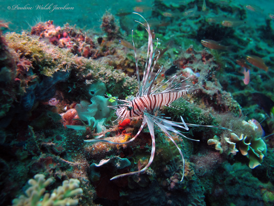 Indicó que el cuerpo del pez león se distingue por una serie de vistosas líneas blancas, marrones, violetas y rojas, y aletas pectorales y dorsales ampliamente desarrolladas a modo de abanico, lo cual le otorga un aspecto exótico y lo hace muy preciado como especie ornamental de acuarios.