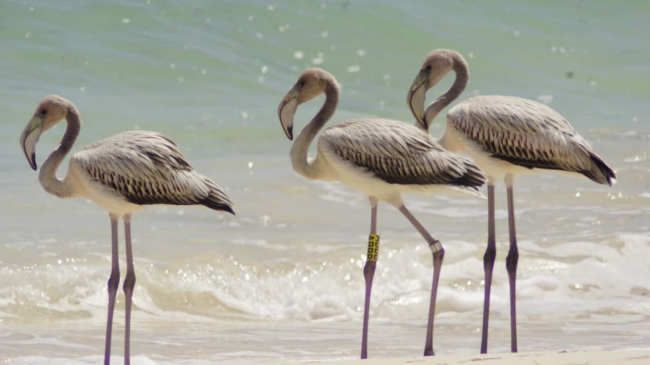 Personal de la Fundación de Parques y Museos de Cozumel (FPMC) registró la llegada de tres ejemplares juveniles de Flamenco Americano (Phoenicopterus ruber) en las playas cercanas a las lagunas del Parque Ecológico Estatal Laguna Colombia. Este acontecimiento fue notable debido a que uno de los ejemplares presentaba un anillamiento y una banda amarilla con las letras ABBB, lo que sugiere un reciente monitoreo, ya que los flamencos aún no presentan su característico color rosado.