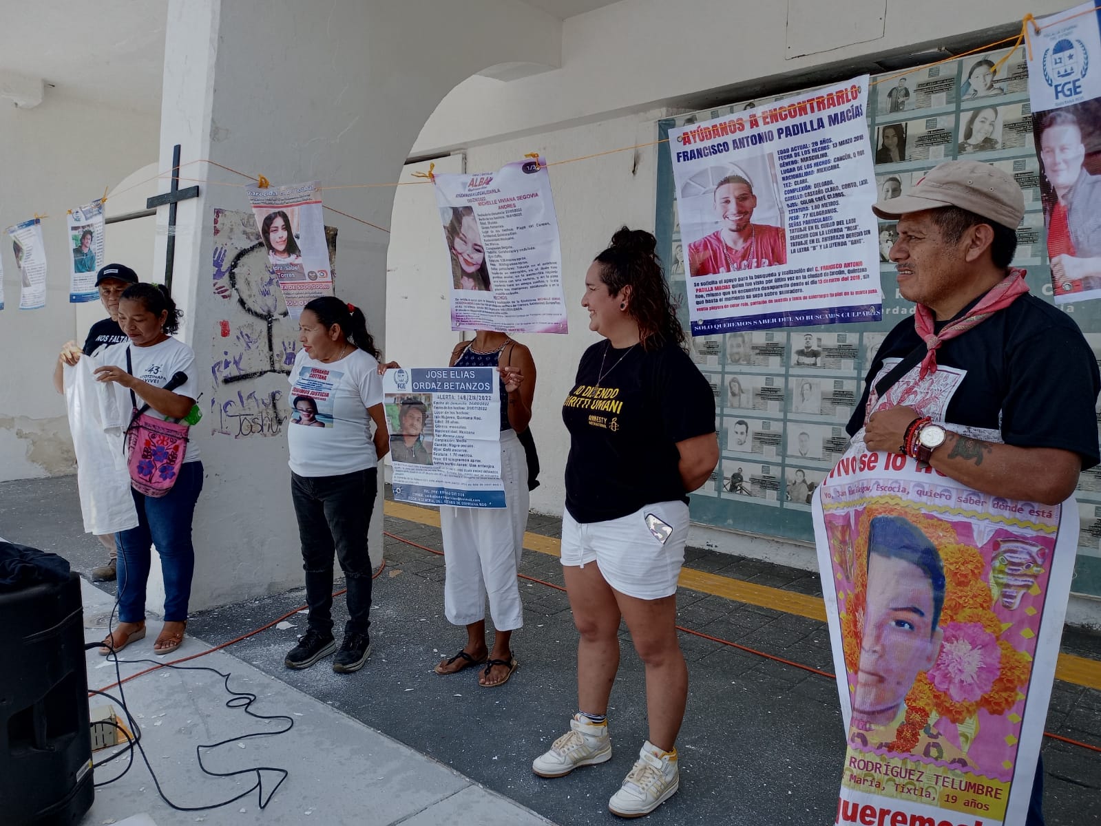 Por su parte, las Madres Buscadoras de Quintana Roo instalaron su tradicional tendedero en los bajos del palacio, con las fotografías y fichas de búsqueda de mujeres y hombres desaparecidos en los últimos años en Quintana Roo y tuvieron la visita de una madre cuyo hijo desapareció en Isla Mujeres en el 2022 y otra madre de Guadalajara, quien su hija viajó a Playa del Carmen hace 2 años para un supuesto trabajo y acusó que fue víctima de trata, en apoyo a los normalistas y para exigir justicia por toda persona desaparecida.