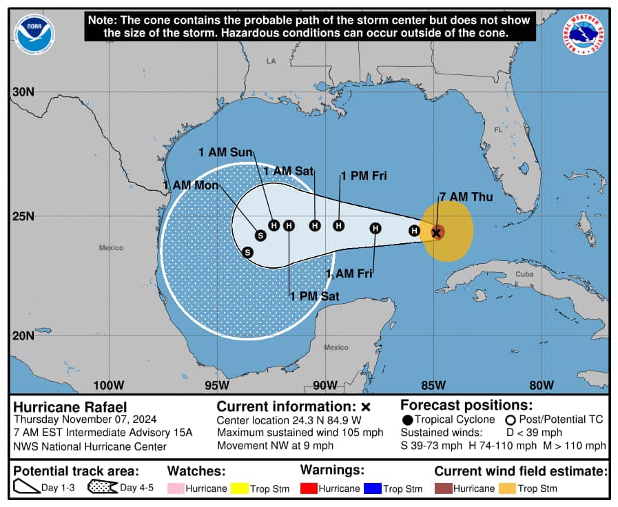 A las 9 horas del jueves 7 de noviembre el centro del huracán Rafael, de categoría 2 en la escala Saffir-Simpson, se localizaba a 320 kilómetros al oeste-noroeste de La Habana, Cuba y a 375 kilómetros al noreste de Cabo Catoche, Quintana Roo. Los pronósticos indican que se adentrará en el Golfo de México.