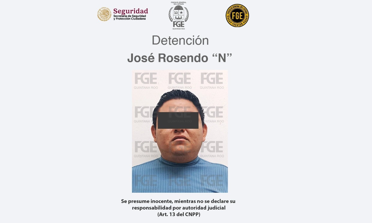 Personal de la Fiscalía General del Estado (FGE) de Quintana Roo y de la Fuerza de Tarea Interinstitucional de 100 días, encabezada por la Secretaría de Seguridad y Protección Ciudadana, en colaboración con la FGE de Yucatán, cumplimentaron una orden de aprehensión en contra de José Rosendo N. por su probable participación en hechos posiblemente constitutivos del delito de homicidio calificado en agravio de un colaborador del Sindicato de Taxistas, Choferes y Similares del Caribe Andrés Quintana Roo, ocurrido en el municipio Benito Juárez.