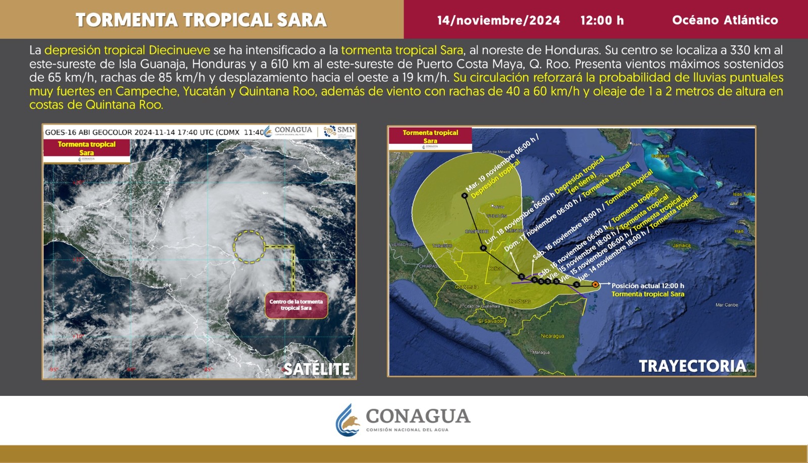 La depresión tropical 19 se intensificó la mañana de este jueves 14 de noviembre a la  tormenta tropical Sara al noreste de Honduras. Por ello, el estado de Quintana Roo emitió alerta azul por acercamiento para el centro y sur de la entidad.