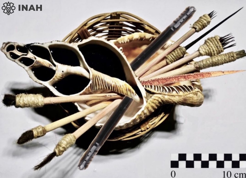 Mediante arqueología experimental, observó que la espina de pez raya y la espina dorsal de pescado arrojaron los mejores resultados para la inyección del pigmento, y advirtió que la caracola de mar cortada por la mitad resultaba funcional para el tatuaje y la escarificación y, probablemente, era uno de los utensilios que manipulaba el gremio de artistas-escribas.