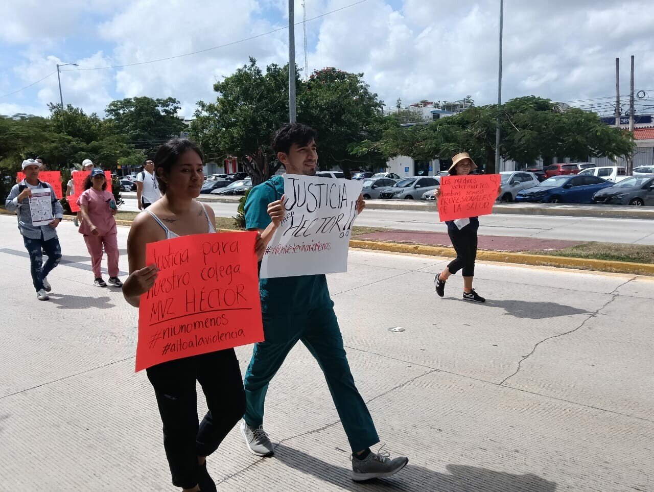 Este martes alrededor del mediodía un grupo de veterinarios de Cancún se manifestó en contra del acoso, violencia y falta de respeto a su profesión, además de exigir justicia, luego del asesinato de Héctor Hernández, un colega en el Estado de México, a quien acuchillaron los dueños de un perrito al que no pudo salvarle la vida.