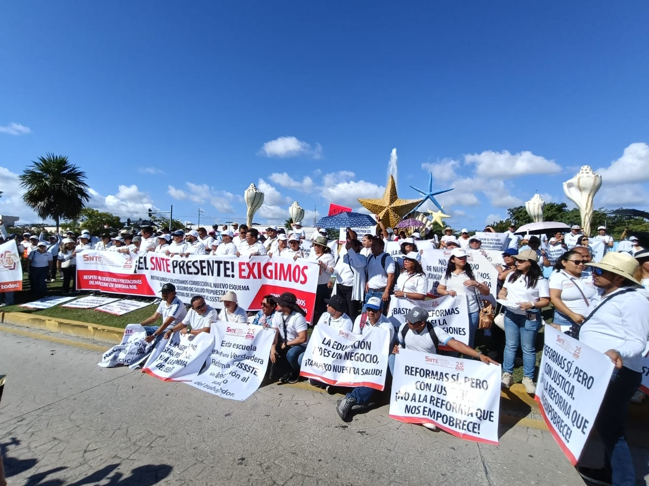 Por tercera ocasión en Cancún, miles de maestros salieron a manifestarse para mostrar su rechazo a la reforma del ISSSTE, exigir salarios justos, pensiones dignas y respeto a su profesión.