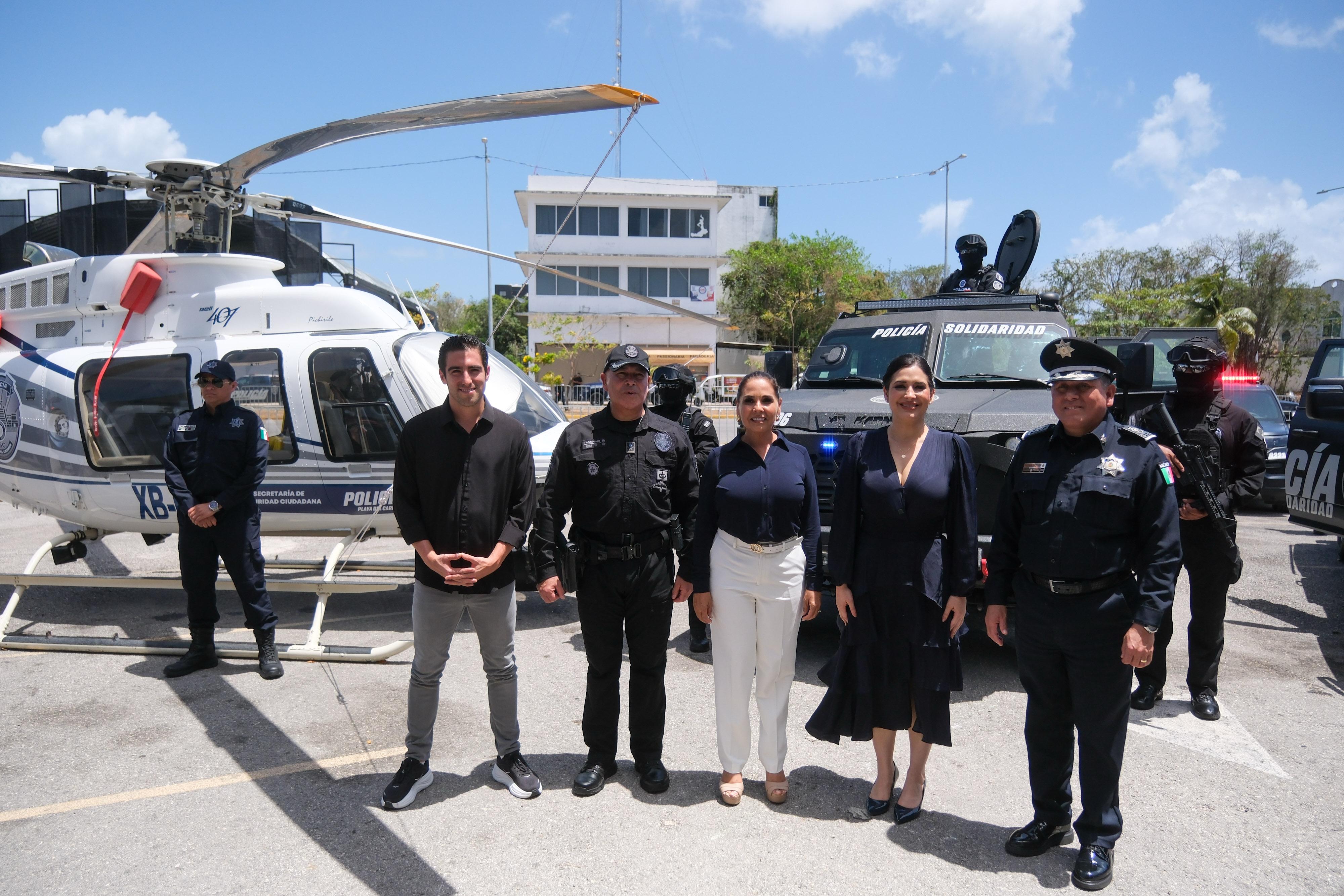 La gobernadora Mara Lezama Espinosa encabezó la ceremonia de entrega de 334 vehículos policiales y un helicóptero a la Secretaría de Seguridad Ciudadana municipal de Playa del Carmen por parte de la presidenta Estefanía Mercado.