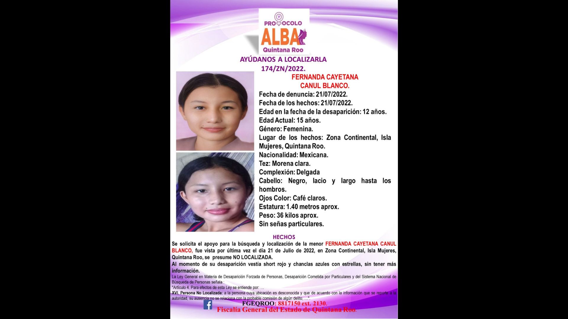 Haciendo uso de la inteligencia artificial, la Fiscalía General del Estado (FGE) de Quintana Roo actualizó la ficha de búsqueda de Fernanda Cayetana Canul Blanco, vista por última vez el 21 de julio de 2022 en la zona continental de Isla Mujeres. Al momento de su desaparición tenía 12 años y la nueva fotografía muestra cómo se vería actualmente, a los 15 años.