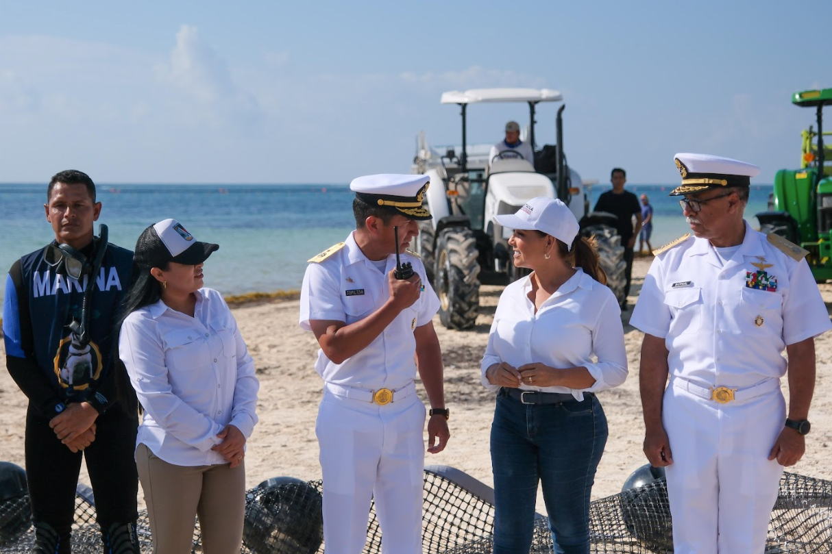 En la playa Ojo de Agua, Mara Lezama, acompañada de la presidenta municipal Blanca Merari Tziu, así como del coordinador de la Estrategia de Atención al Sargazo de la Secretaría de Marina, contralmirante Topiltzin Tlacaletl Flores Jaramillo, aseguró que ya estamos preparados para el inicio de la temporada de sargazo 2025.