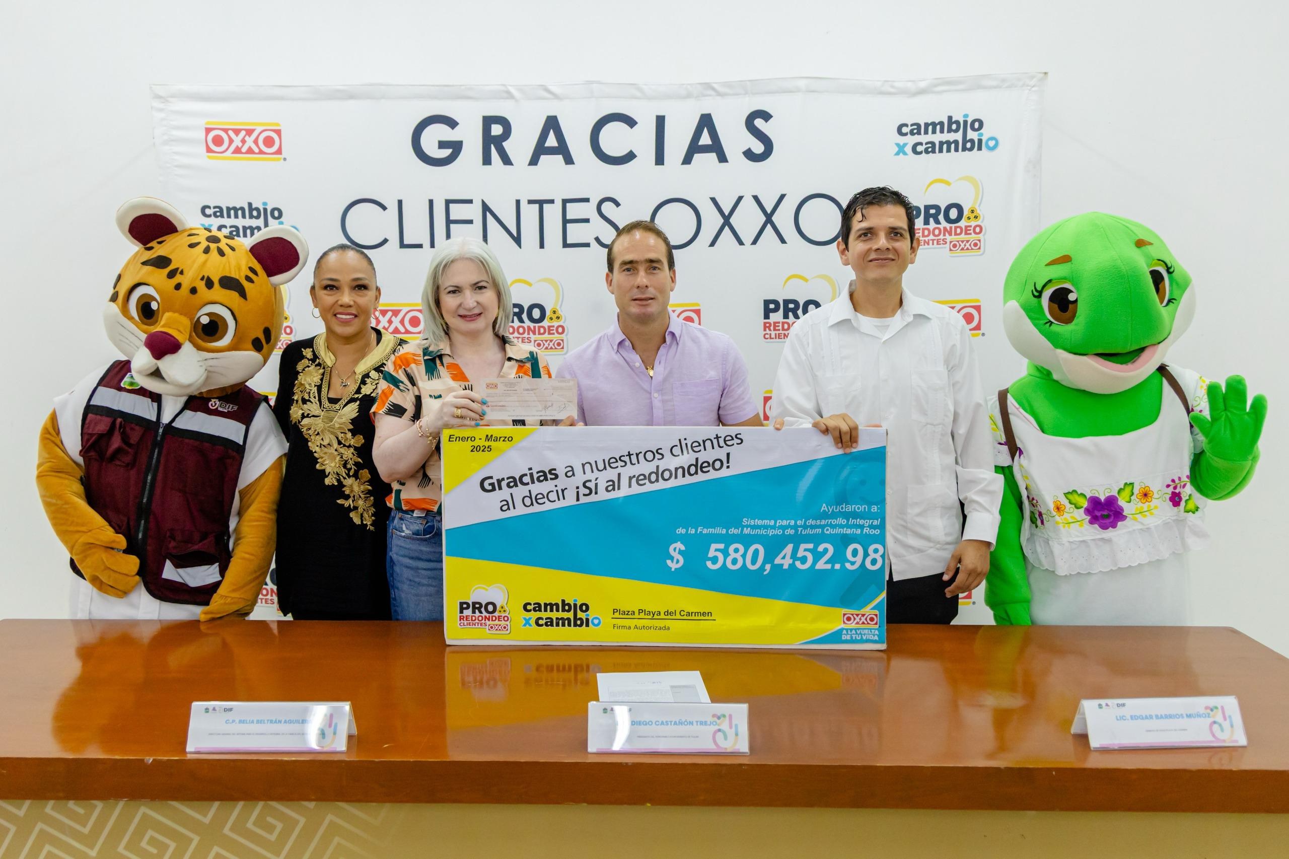 Para seguir impulsando el desarrollo de las niñas, niños, adolescentes y familias de Tulum, este viernes 25 de abril el presidente municipal Diego Castañón Trejo y en representación de la presidenta honoraria del DIF Tulum, Paulina Quiroga de Castañón, la directora del Sistema, Belia Beltrán Aguilera y Jazmín Aguilar, representante del voluntariado de DIF Tulum, recibieron por parte del gerente de Oxxo Playa del Carmen, Edgar Barrios Muñoz, el cheque de la recaudación del programa Redondeo Clientes Oxxo en el periodo enero-marzo del 2025.