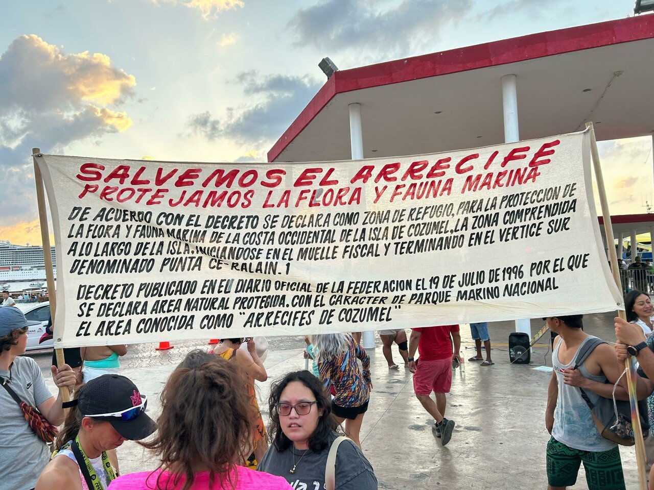 El pasado 23 de abril hubo protestas tanto en el muelle fiscal de la isla como en el mar, a la altura del arrecife Villablanca, mismo que se vería afectado con el proyecto, y está programada una marcha este viernes 9 de mayo desde Sunset Beach hacia el palacio municipal de Cozumel a las 17:30 horas.