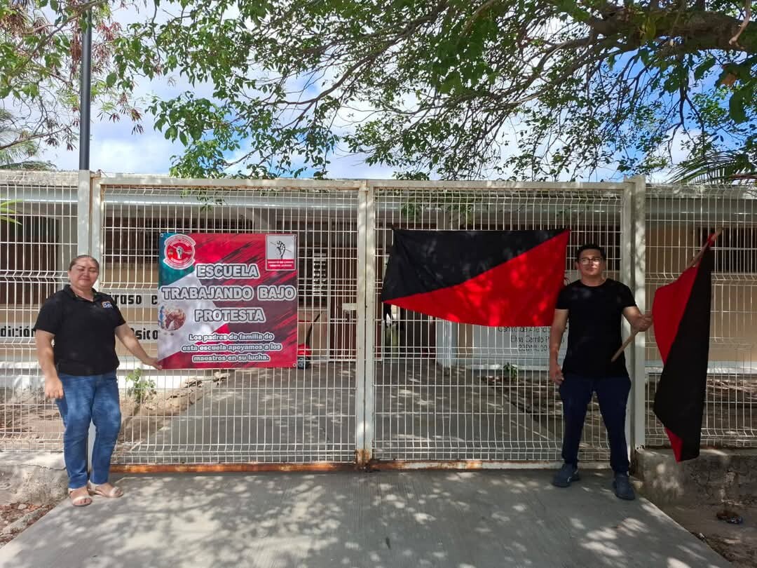 En Cancún, en varias escuelas, desde preescolar hasta secundarias, los docentes colocaron su bandera rojinegra, para mostrar que están en huelga, tal como fue el llamado que se hizo a nivel nacional.