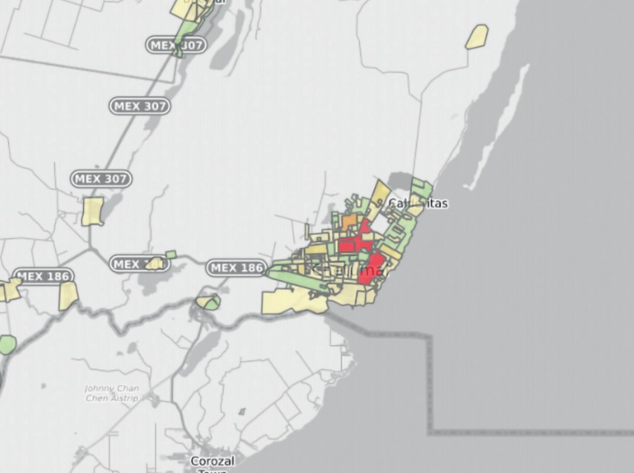 De acuerdo a los datos del geoportal.qroo, al 20 de julio, la colonia Solidaridad cuenta con 31 casos activos y, junto con la Proterritorio y la Adolfo López Mateos, tiene “código rojo”. En naranja se encuentra la Caribe, con 23 casos, y en amarillo, la Payo Obispo, con 18. Estas zonas concentran más de 15 por ciento de los casos activos en Othón P. Blanco, que este lunes sumó mil 555, con 62 defunciones por la enfermedad.
