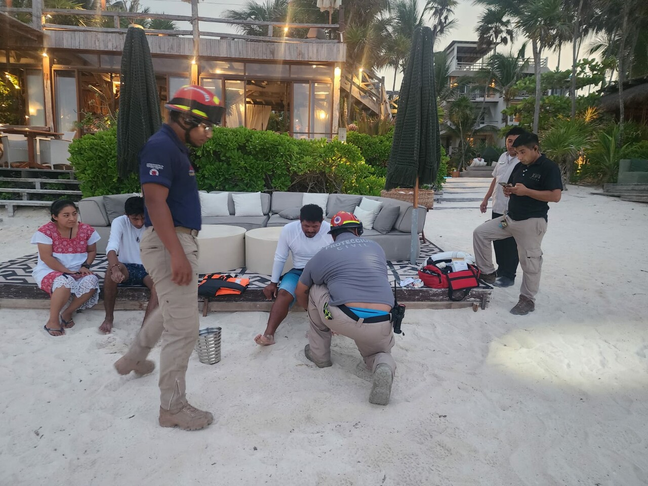 En tierra fueron atendidos por elementos de la Dirección de Protección Civil y paramédicos de una empresa privada, quienes les brindaron los primeros auxilios. Sólo uno de los tripulantes, el capitán, presentó una herida leve y fue vendado en el lugar, aunque se le trasladó a la clínica Costamed.