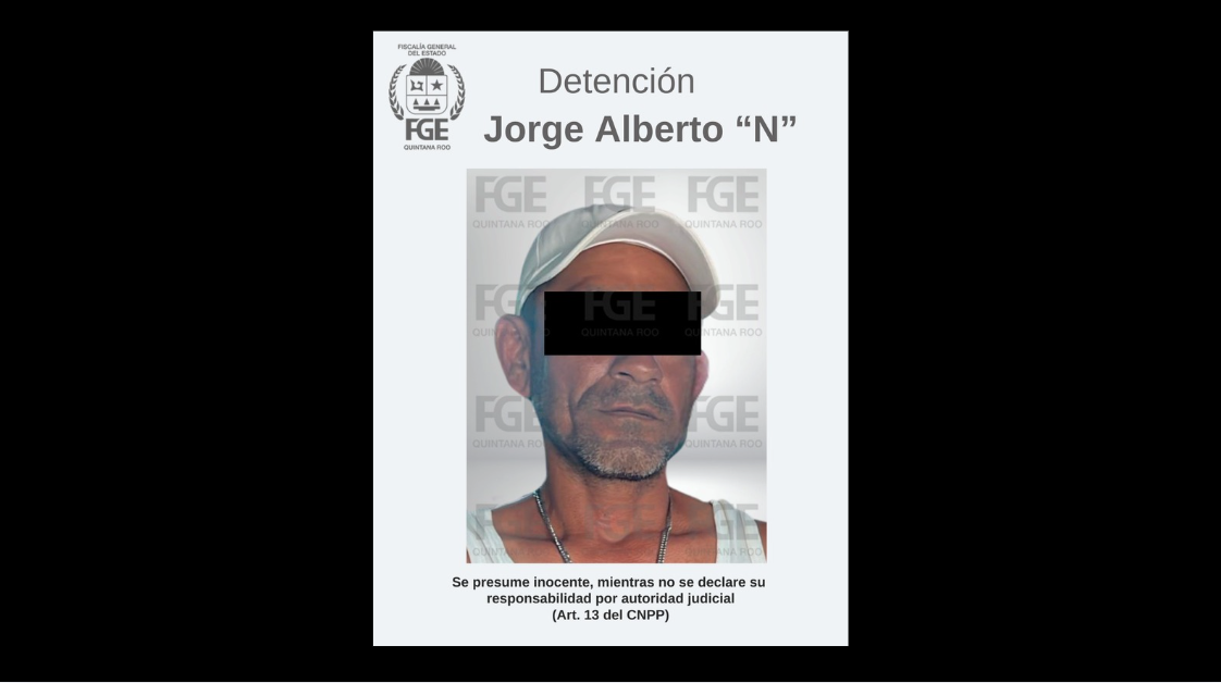 La Fiscalía General del Estado (FGE) de Quintana Roo informó la detención de Jorge Alberto N. por su probable participación en hechos posiblemente constitutivos del delito de feminicidio en grado de tentativa, en agravio de una mujer a quien roció con ácido.