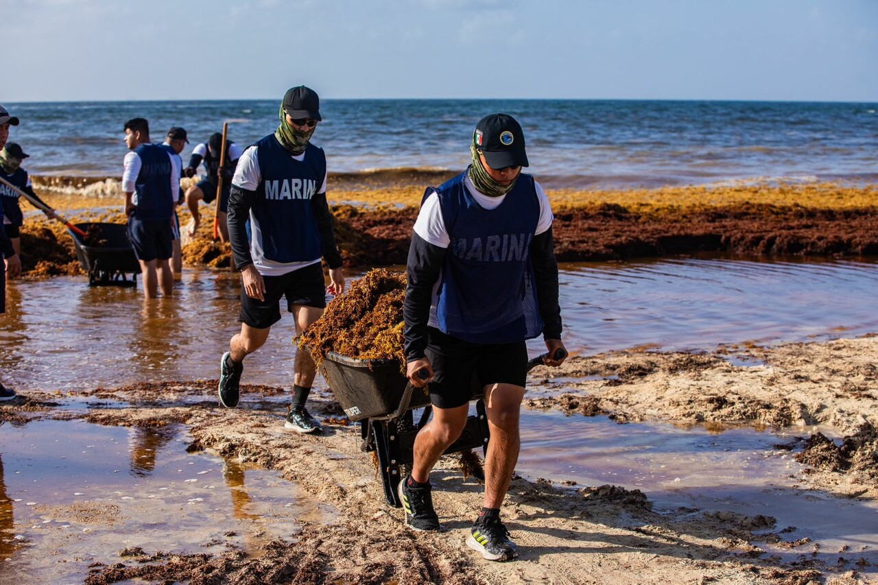 El operativo se desarrolla en dos fases: una primera de recolección manual desde muy temprano, seguida del traslado y disposición final del sargazo con maquinaria especializada, lo que ha permitido contener hasta 80 por ciento del alga que ha arribado a las costas en esta temporada.