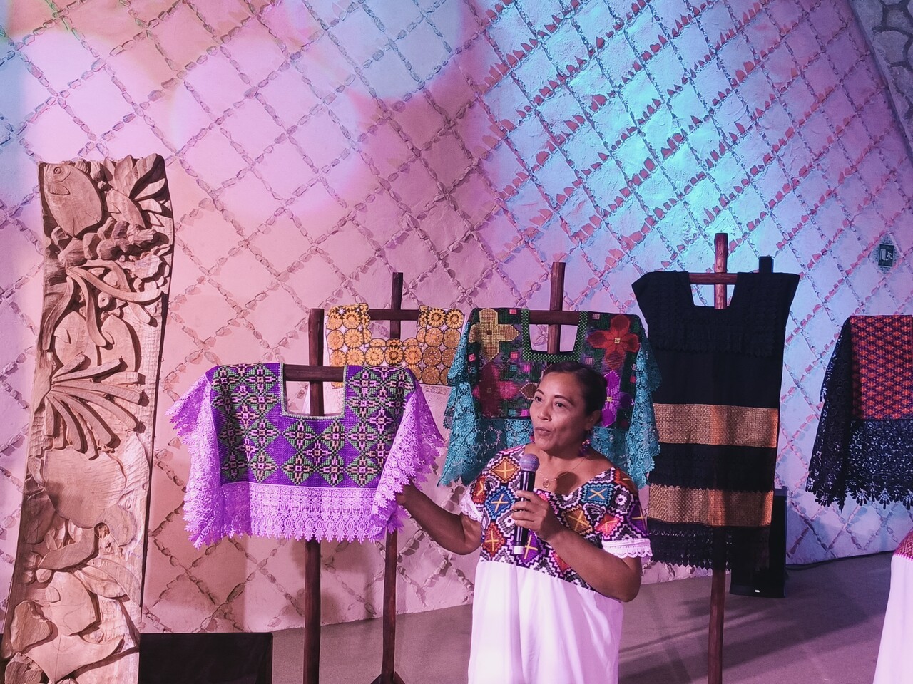 Sobre las prendas que realizan, resaltó la diferencia que manejan ellas como bordadoras mayas de Quintana Roo con las de Yucatán, pues en el vecino estado prevalecen los diseños de flores y animales, mientras que aquí lo hacen los diseños geométricos y de grecas; igualmente, en el Caribe Mexicano se opta para la vestimenta femenina por el hipil con solapa.