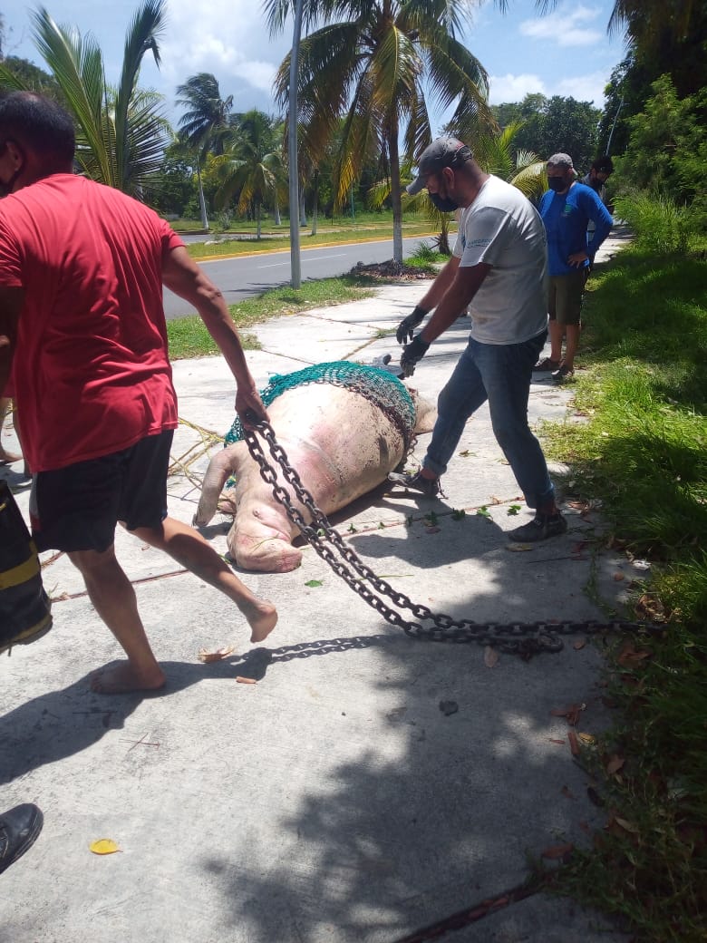 Elementos del cuerpo de bomberos de Othón P. Blanco recolectaron el ejemplar, de aproximadamente 2.7 metros de longitud total, en avanzado estado de descomposición.